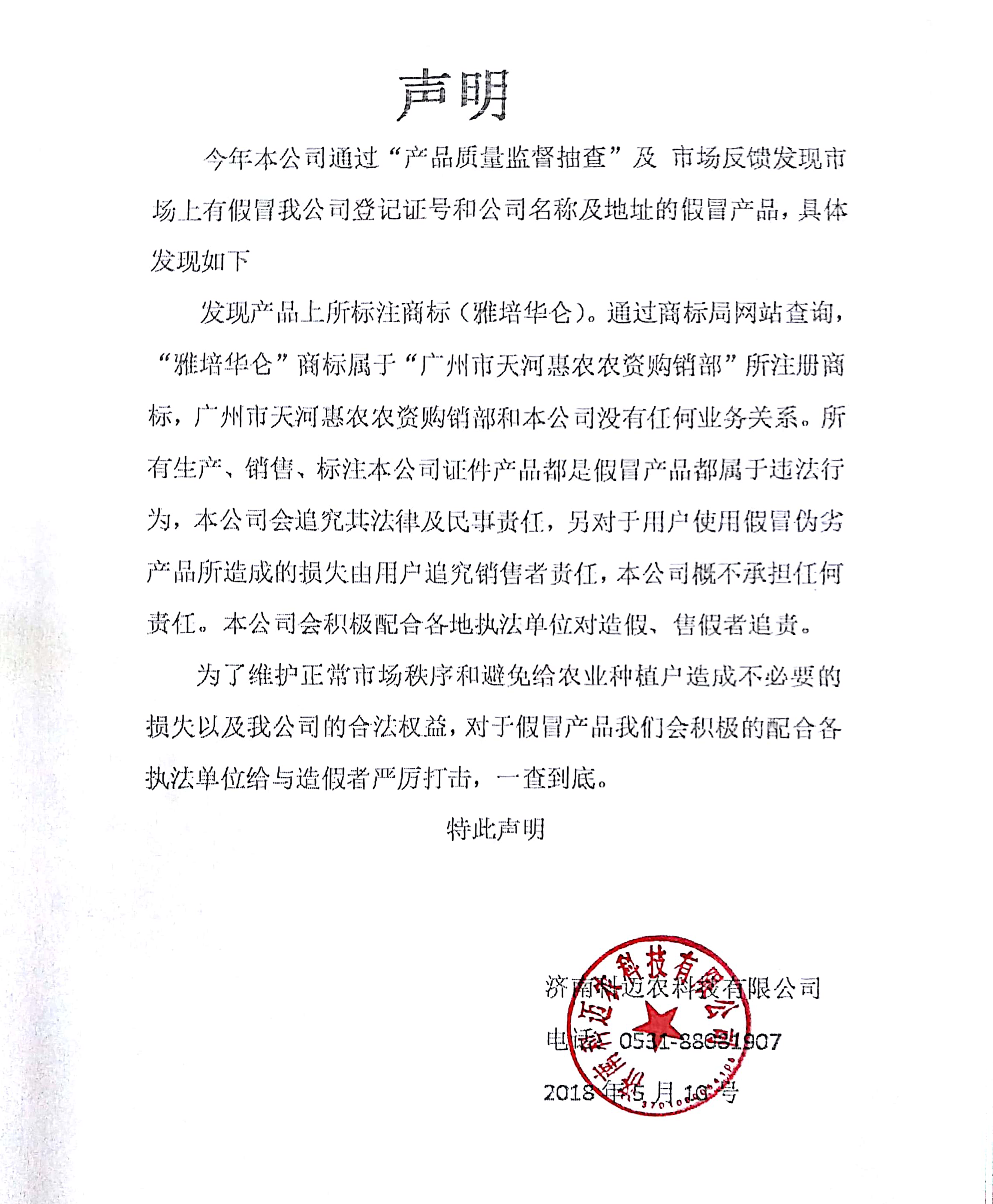 為了維護(hù)正常市場秩序和避免給農(nóng)業(yè)種植戶造成不必要的損失以及我公司的合法權(quán)益,對(duì)于假冒產(chǎn)品我們會(huì)積極的配合各地執(zhí)法單位給予造假者嚴(yán)厲打擊,一查到底。