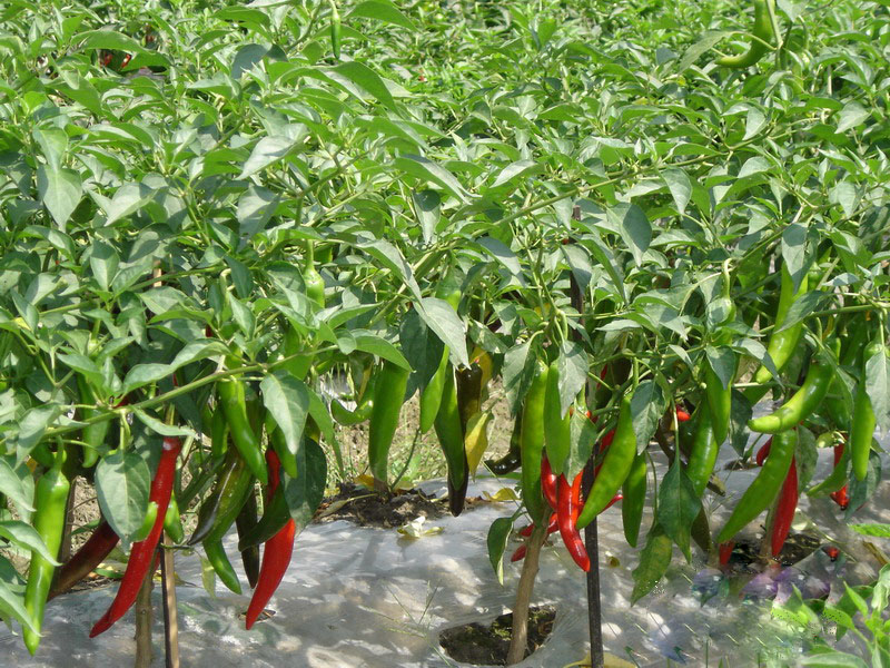 第三,精細配方施肥。辣椒喜肥又怕肥,對肥料十分敏感。要做到有機肥與無機肥配合施用,有機肥一定要充分腐熟;因土因苗酌情施用氮肥,特別是不能過量施用尿素;配施磷、鉀和微量元素肥,防止“失綠”癥狀發(fā)生;避過高溫,用腐熟的低濃度清水糞追肥;預防脫肥,確保全程營養(yǎng)充足,防止“缺綠”落黃。在具體操作上,每畝基肥可施用腐熟的土雜肥5000公斤或禽畜廄肥4000公斤,配施磷肥30~40公斤,硫酸鉀20公斤左右,既可撒施后翻耕耙勻,又可開溝條施。追肥一般三次,一是提苗肥,移栽幼苗成活后,每畝可追腐熟的清水糞500~800公斤,出現(xiàn)兩層果枝后,再追腐熟的人糞尿1000~1500公斤。辣椒的生育期較長,采果2~3批后,還可視苗情每畝追尿素10公斤左右。